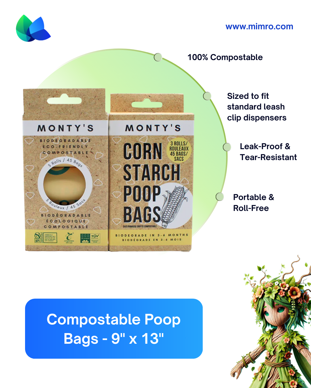 MONTY’S 45PCS Compostable Cornstarch Poop Bags - 9 X 13"| Available on mimro
